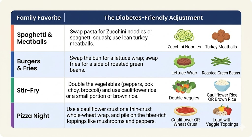 Once you have your "Master List," look at it through the lens of diabetes-friendly modifications. It is much easier to tweak a favorite meal than to force yourself to eat something brand new. Also, this saves money as you aren’t randomly buying food at the grocery store, but rather you are shopping with purpose and a plan.